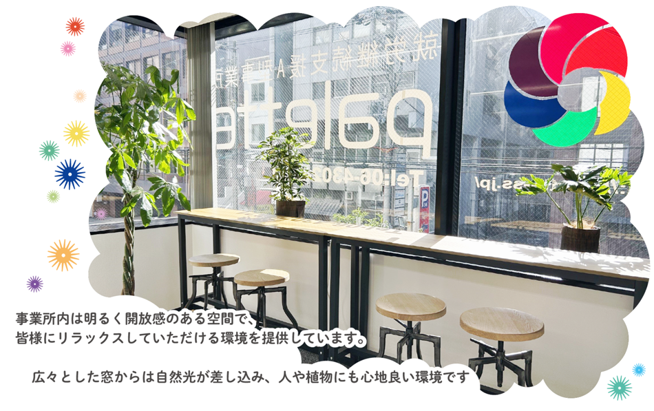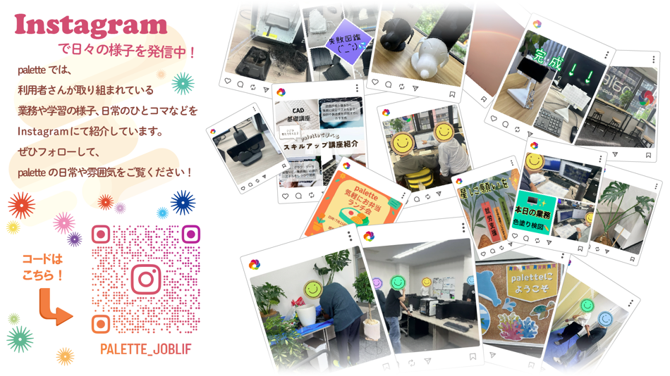 palette(パレット)へようこそ。障がい者就労継続支援A型事業所paletteは、新たな色を生み出す場所です。それぞれの個性に多彩な技術(色)を加え、社会というキャンバスに送り出すことを目指しています。ここでは、個々の個性に最適な技術を学び、身につけることで、自分自身や家族、そして社会を笑顔と幸せで満たす人材を育成しています。皆様の未来が明るく彩られるよう、全力でサポートさせていただきます。