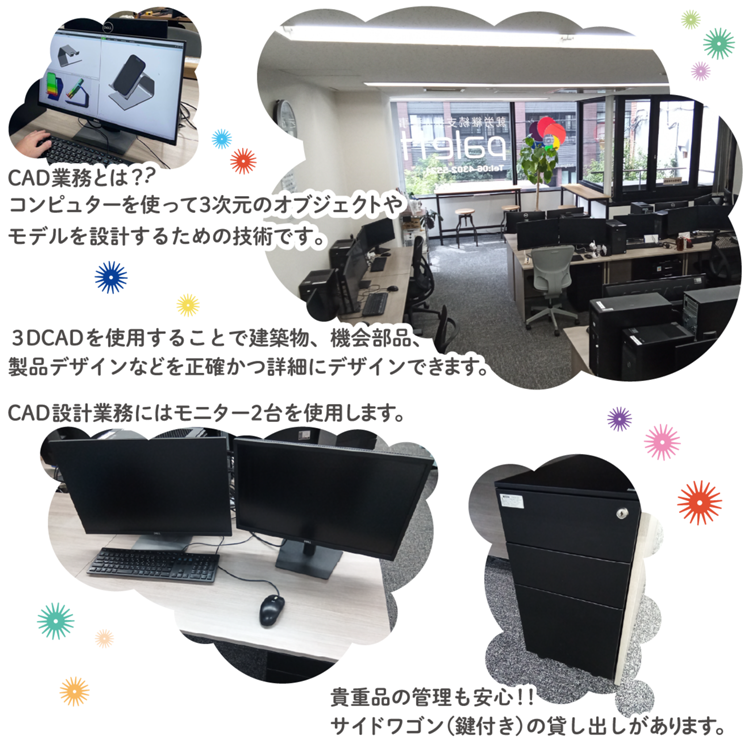 3DCAD業務・IT業務・軽作業があり、専門的なスキルも習得できます。